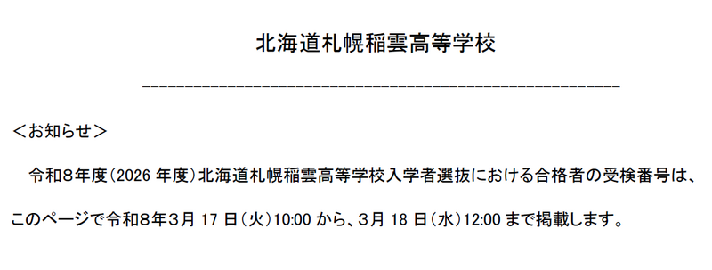 令和8年度(2026年度)北海道札幌稲雲高等学校 全日制課程 一般入学者選抜実施要項はこちらです。